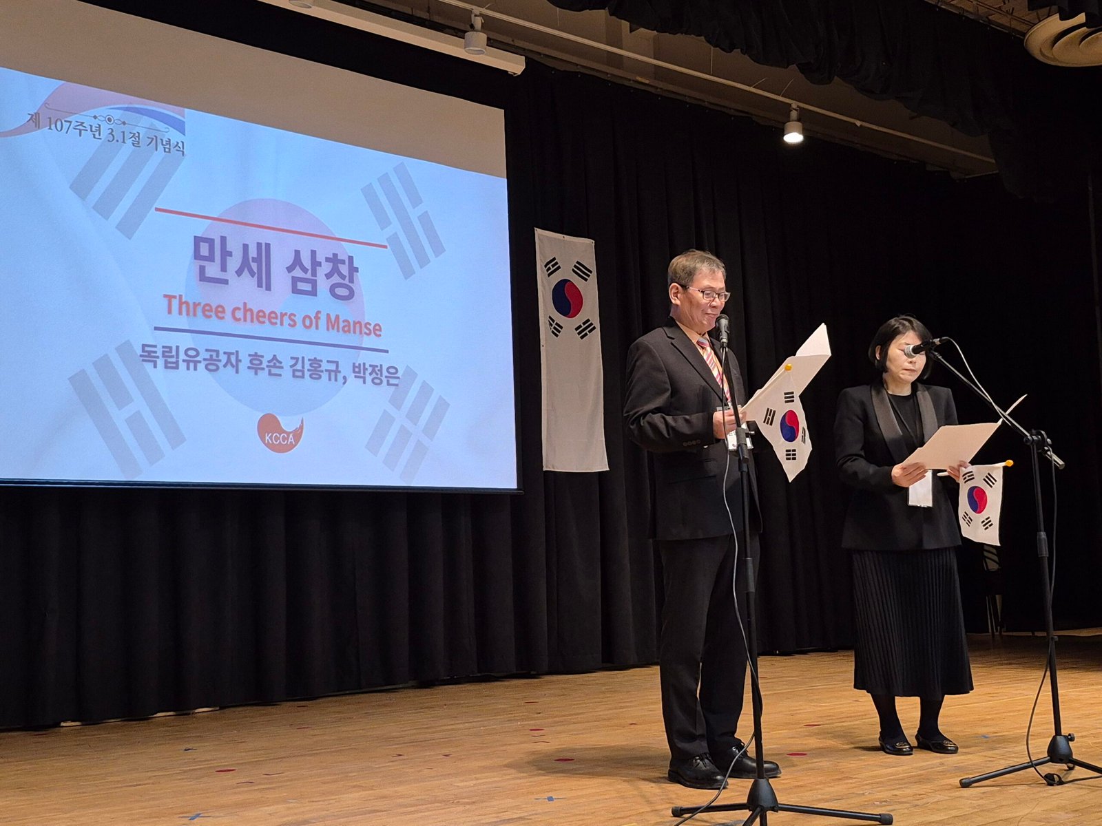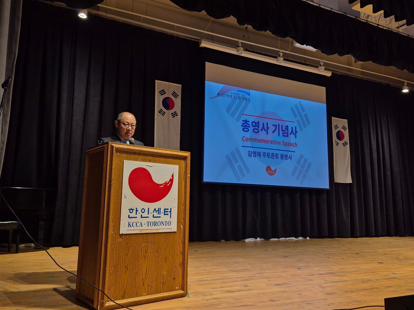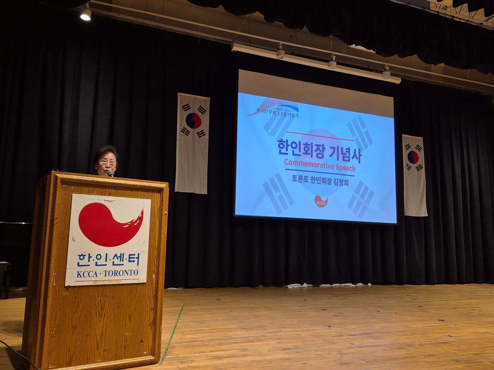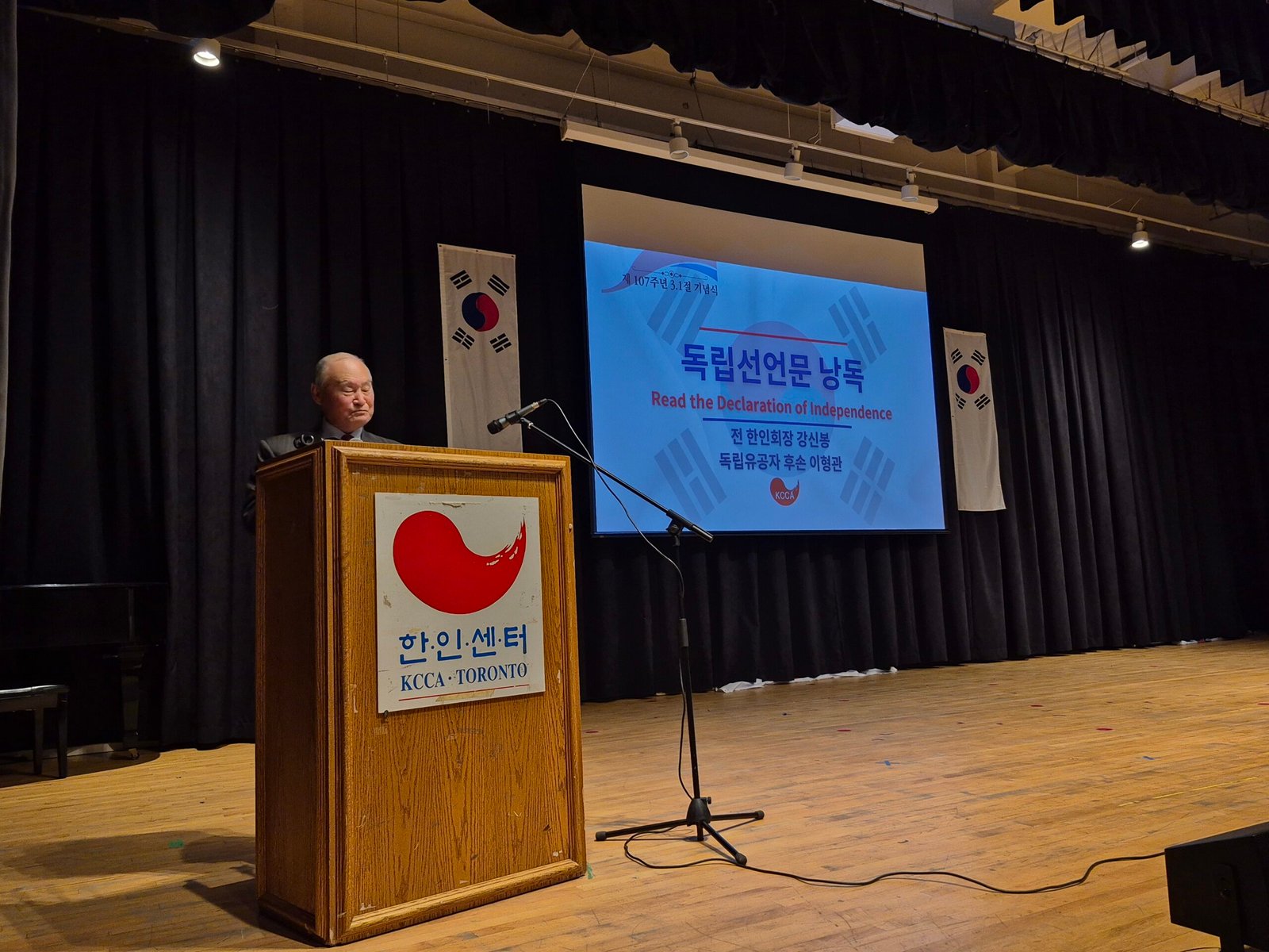 김예원 씨의 사회로 진행된 기념식은 국민의례로 시작되었다. 트럼펫 연주자 정이든 씨의 연주에 맞춰 성우 정은희 씨가 ‘국기에 대한 맹세’를 낭독하며 엄숙한 분위기를 이끌었으며, 이어 소프라노 김은정 씨와 테너 김기훈 씨의 선도로 참석자 전원이 애국가와 캐나다 국가 ‘오 캐나다(O Canada)’를 제창하였다. 이어 김정희 토론토 한인회장의 기념사가 있었다. 김 회장은 기념사를 통해 삼일운동이 지닌 역사적 의미와 자유·평화·연대의 가치를 강조하며, 이를 오늘날 캐나다 사회 속 한인동포 사회의 책임과 역할로 계승해 나갈 것을 당부하였다. 또한 김영재 총영사의 기념사도 함께 전해졌으며, 독립선언문 낭독 순서에서는 전 토론토 한인회장강신봉 씨와 국가유공자이형관 씨가 참여해 당시의 결연한 의지를 되새겼다.