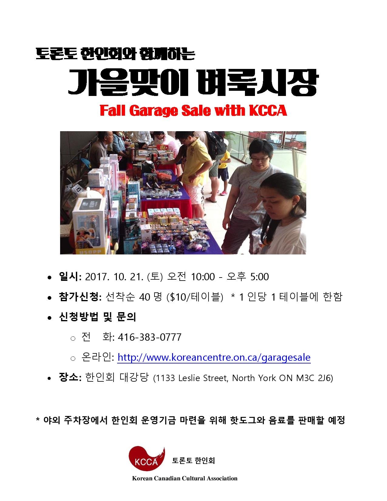 토론토 한인회에서는 10월 21일(토) 가을맞이 가라지 세일을 개최합니다.