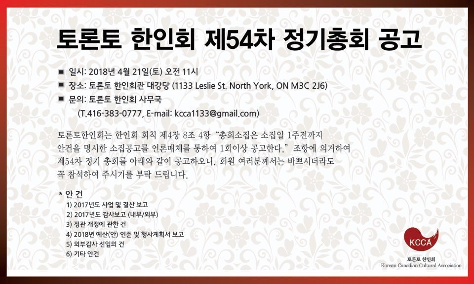 토론토 한인회 제54차 정기총회 공고