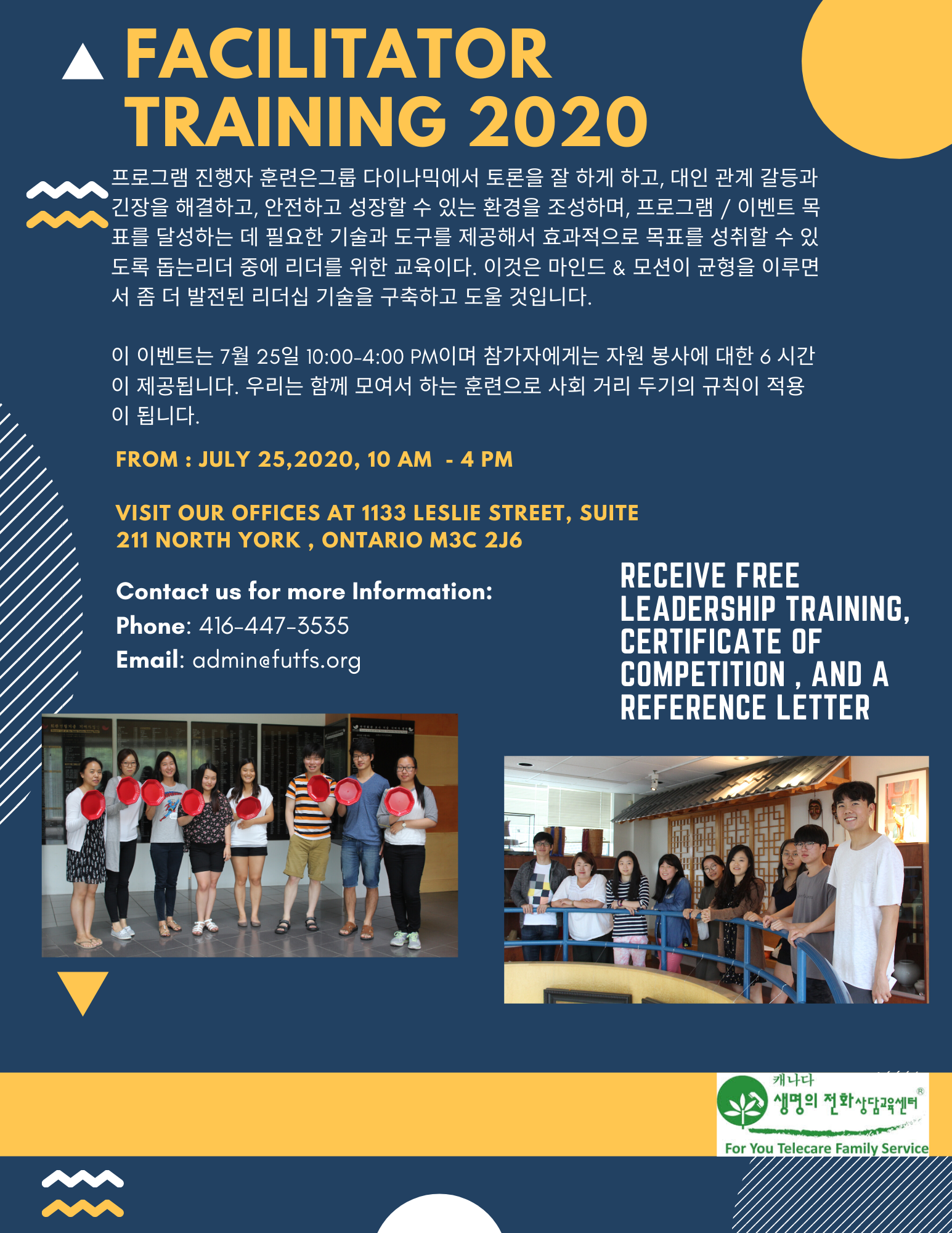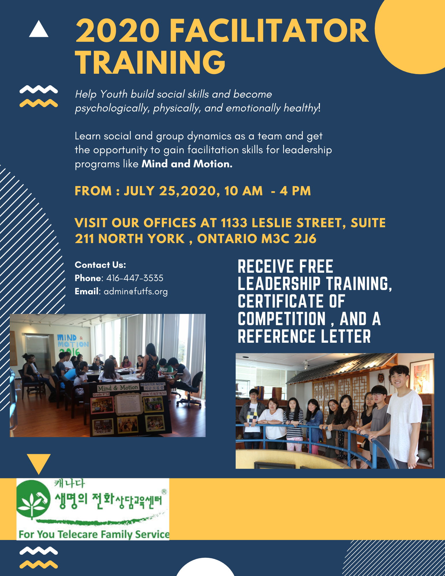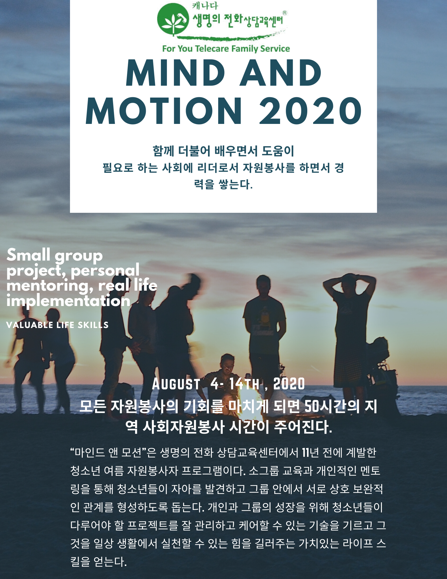 저희가 지난 2008년부터 11년 동안 어디에서나 펀딩의 도움 없이 유스 프로그램을 계발하여 실시해왔습니다. 이번의 COVID-19로 인해 여러가지 제약이 있지만 저희 생명의 전화 상담교육센터는 청소년들에게 꼭 필요한 Facilitator Training 과 MIND AND MOTION은 유스 프로그램 디렉터와 함께 상황에 따른 조치로 화상 채팅과 직접 만나는 것을 병행해서 실시하려고 합니다.