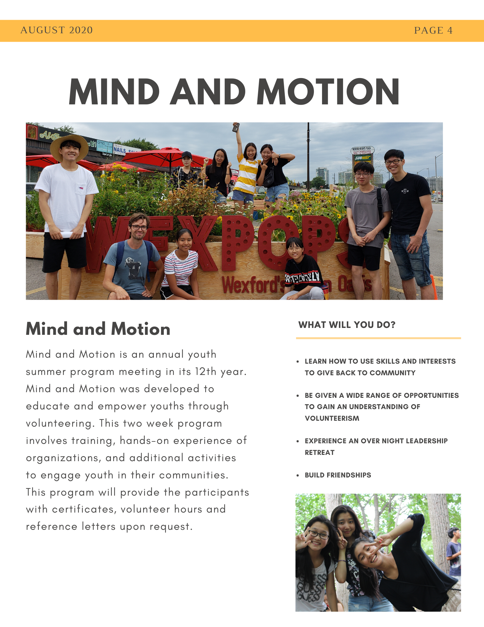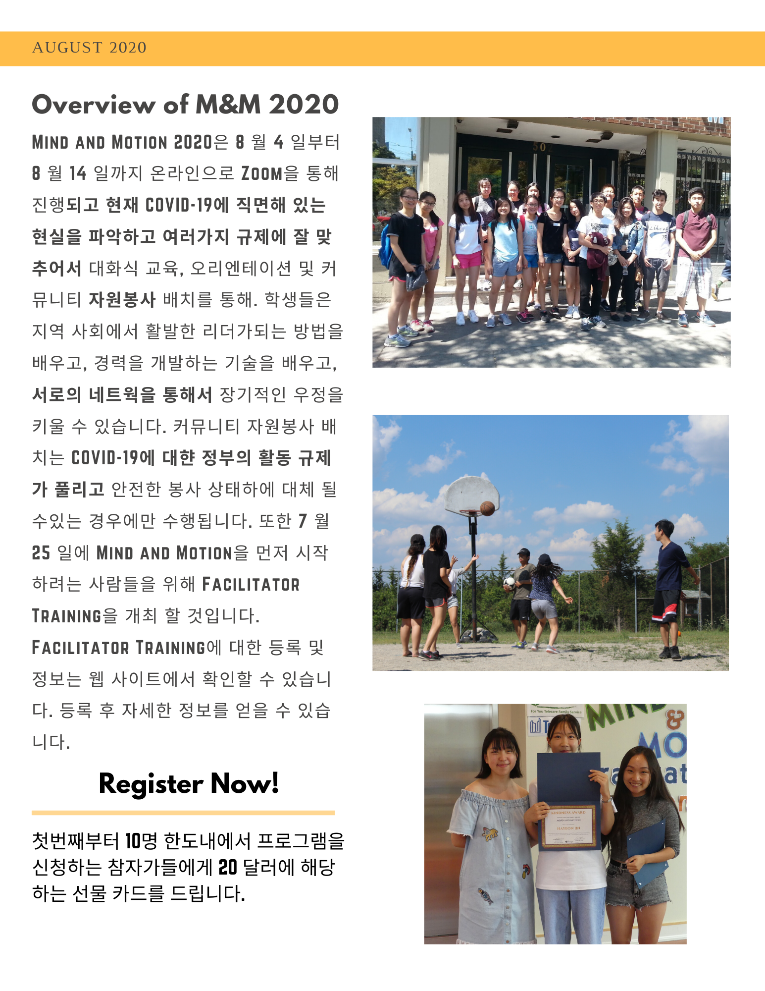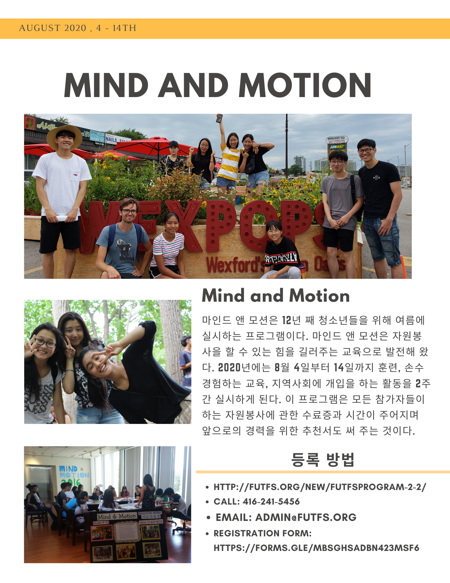 저희가 지난 2008년부터 11년 동안 어디에서나 펀딩의 도움 없이 유스 프로그램을 계발하여 실시해왔습니다. 이번의 COVID-19로 인해 여러가지 제약이 있지만 저희 생명의 전화 상담교육센터는 청소년들에게 꼭 필요한 Facilitator Training 과 MIND AND MOTION은 유스 프로그램 디렉터와 함께 상황에 따른 조치로 화상 채팅과 직접 만나는 것을 병행해서 실시하려고 합니다.