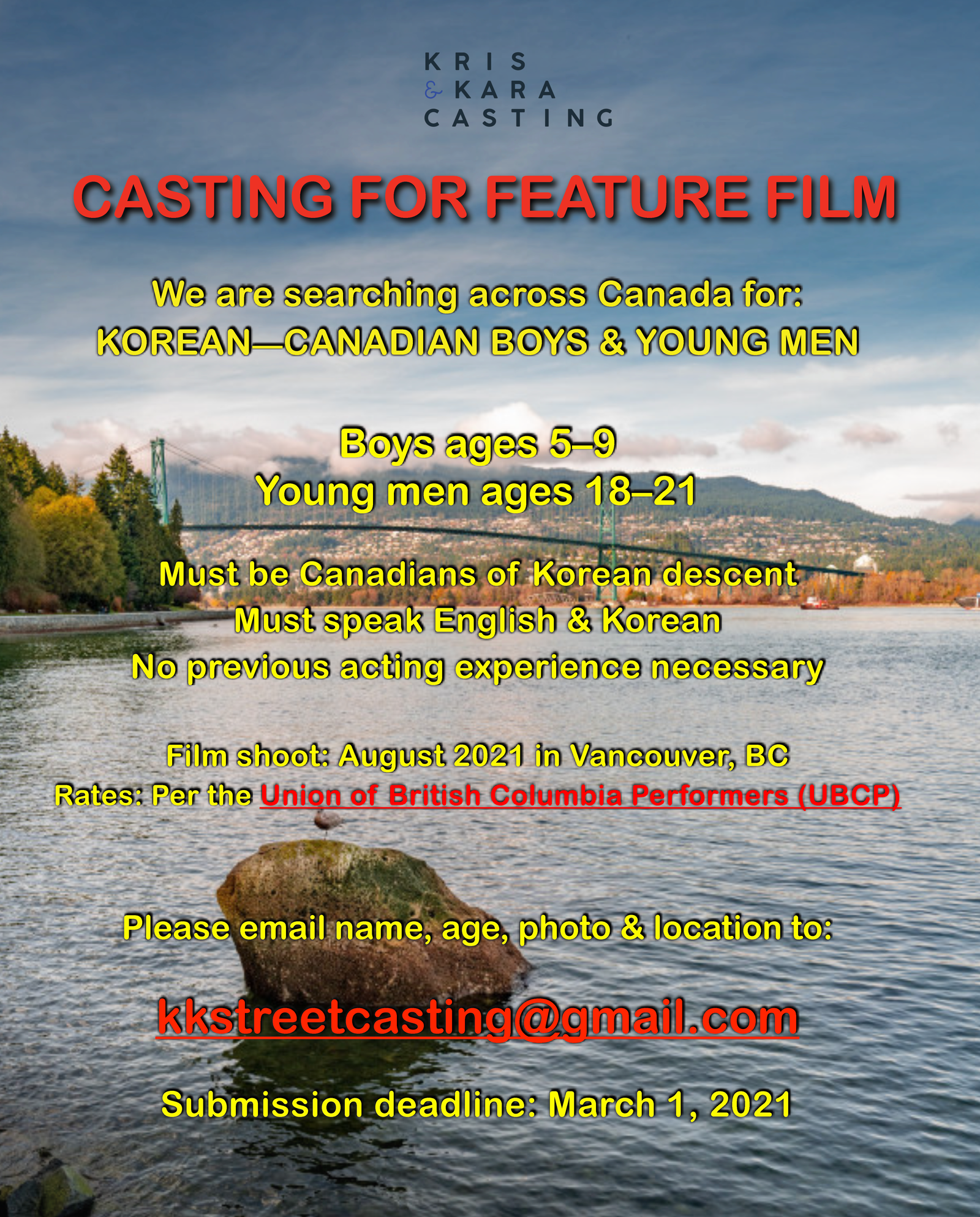 We're searching across Canada for Korean-Canadian boys between the age of 5-9 and young men ages 18-21 for leading roles.