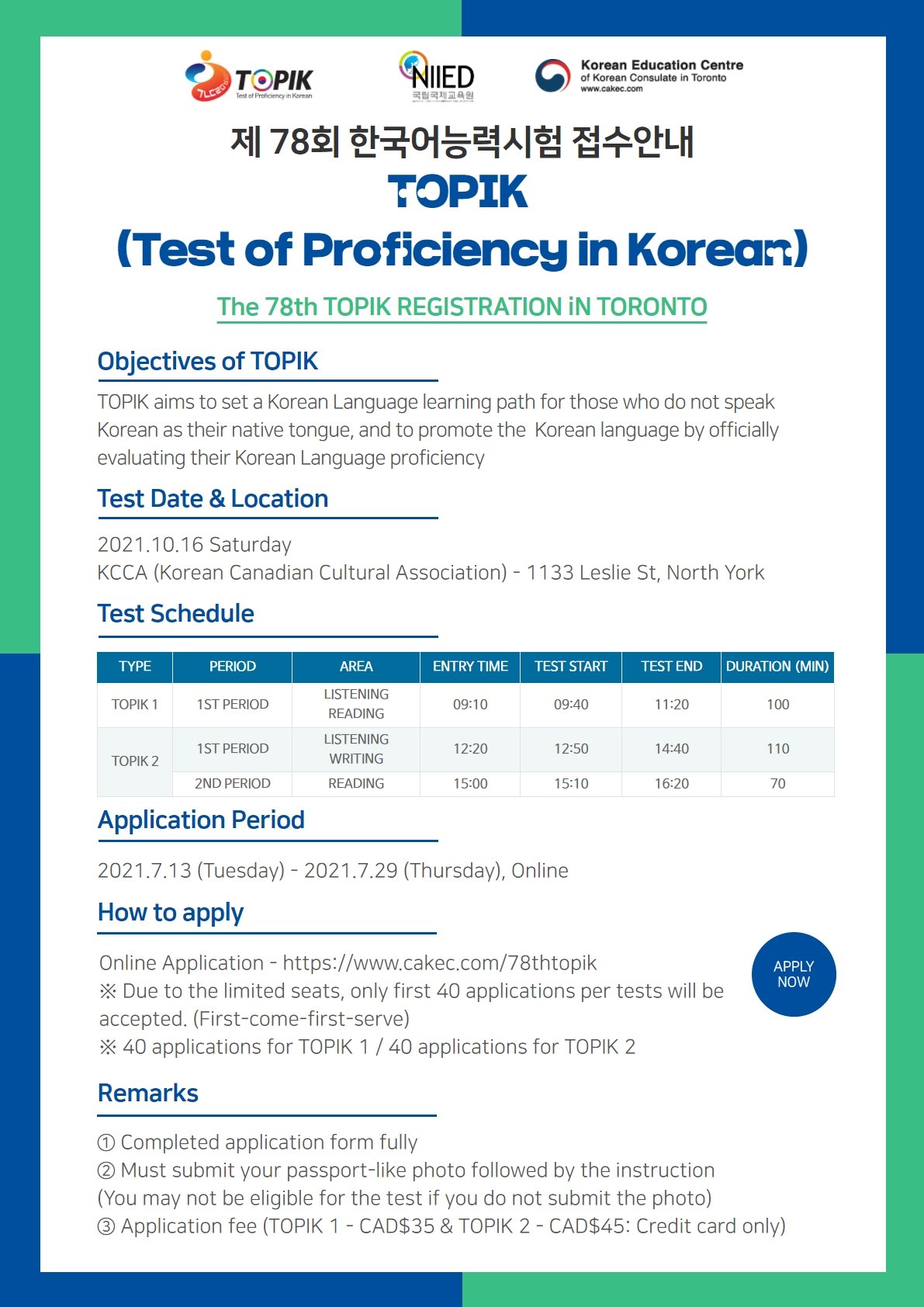 2021년 처음으로 시행되는 제 78회 한국어능력시험이 10월 16일 토론토한인회관에서 진행되며, 7월 79일까지 온라인을 통해 응시원서 접수를 받고 있습니다.