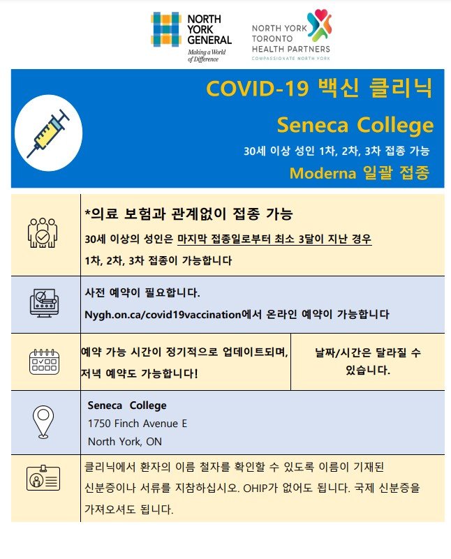 세네카 칼리지에서 1차, 2차, 3차 백신 접종이 가능합니다.