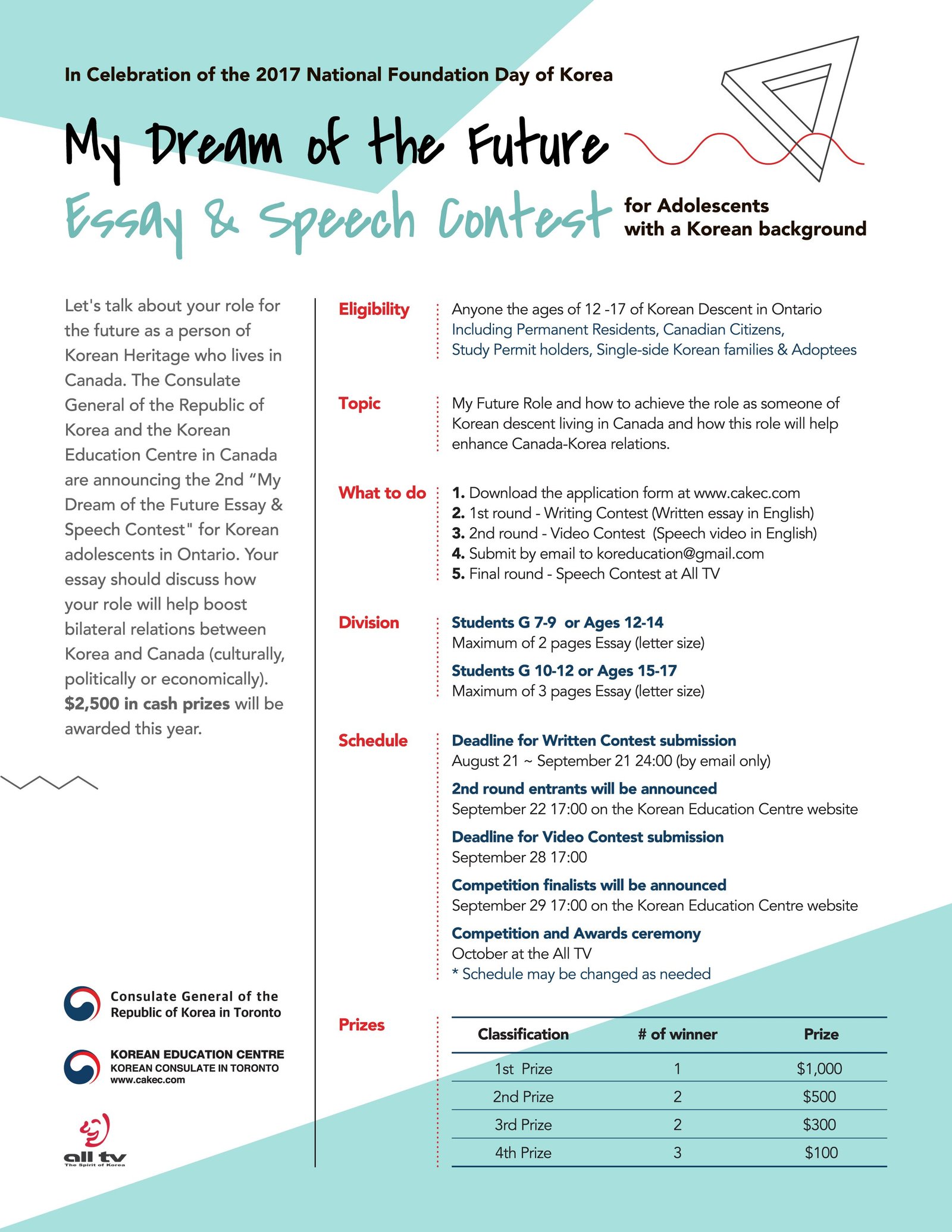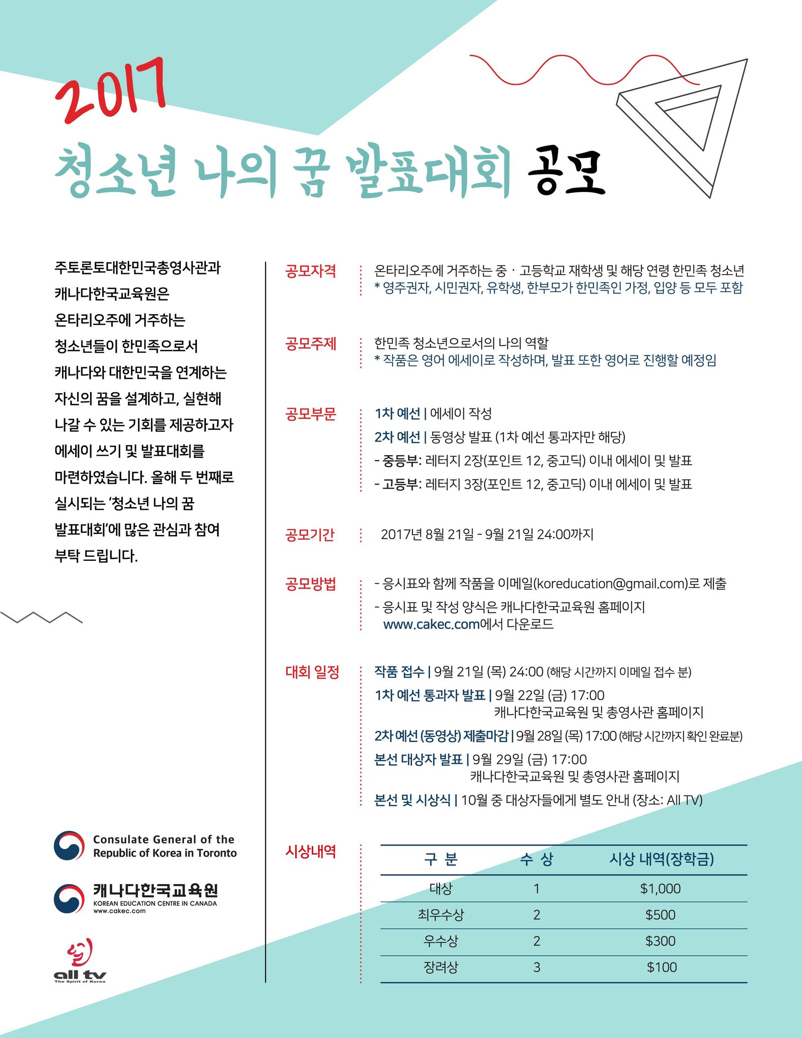 □ 주토론토대한민국총영사관(총영사 강정식) 캐나다한국교육원은 2017년 국경일을 기념하기 위해 제2회 청소년 ‘나의 꿈 영어 에세이 발표대회’를 개최한다.