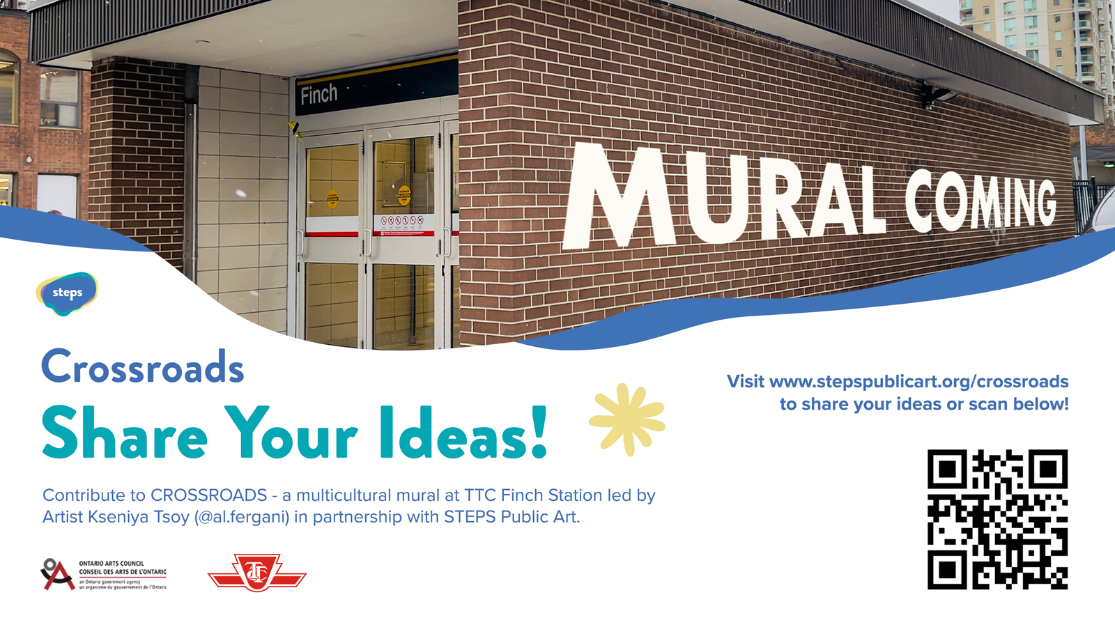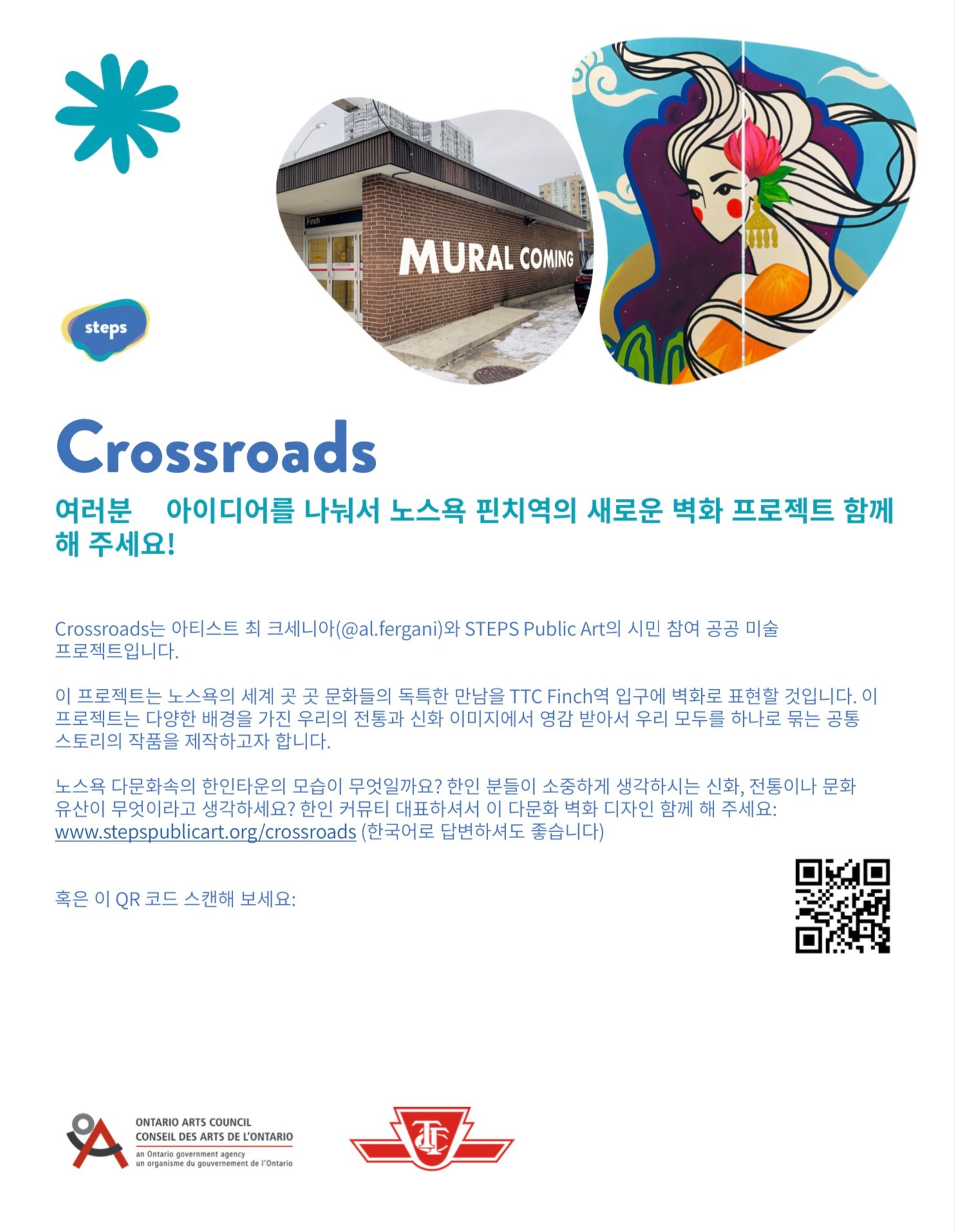 Crossroads는 아티스트 최 크세니아(@al.fergani)와 STEPS Public Art의 시민 참여 공공 미술 프로젝트입니다.이 프로젝트는 노스욕의 세계 곳곳 문화들의 독특한 만남을 TTC Finch역 입구에 벽화로 표현할 것입니다. 이 프로젝트는 다양한 배경을 가진 우리의 전통과 신화 이미지에서 영감 받아서 우리 모두를 하나로 묶는 공통 스토리의 작품을 제작하고자 합니다.