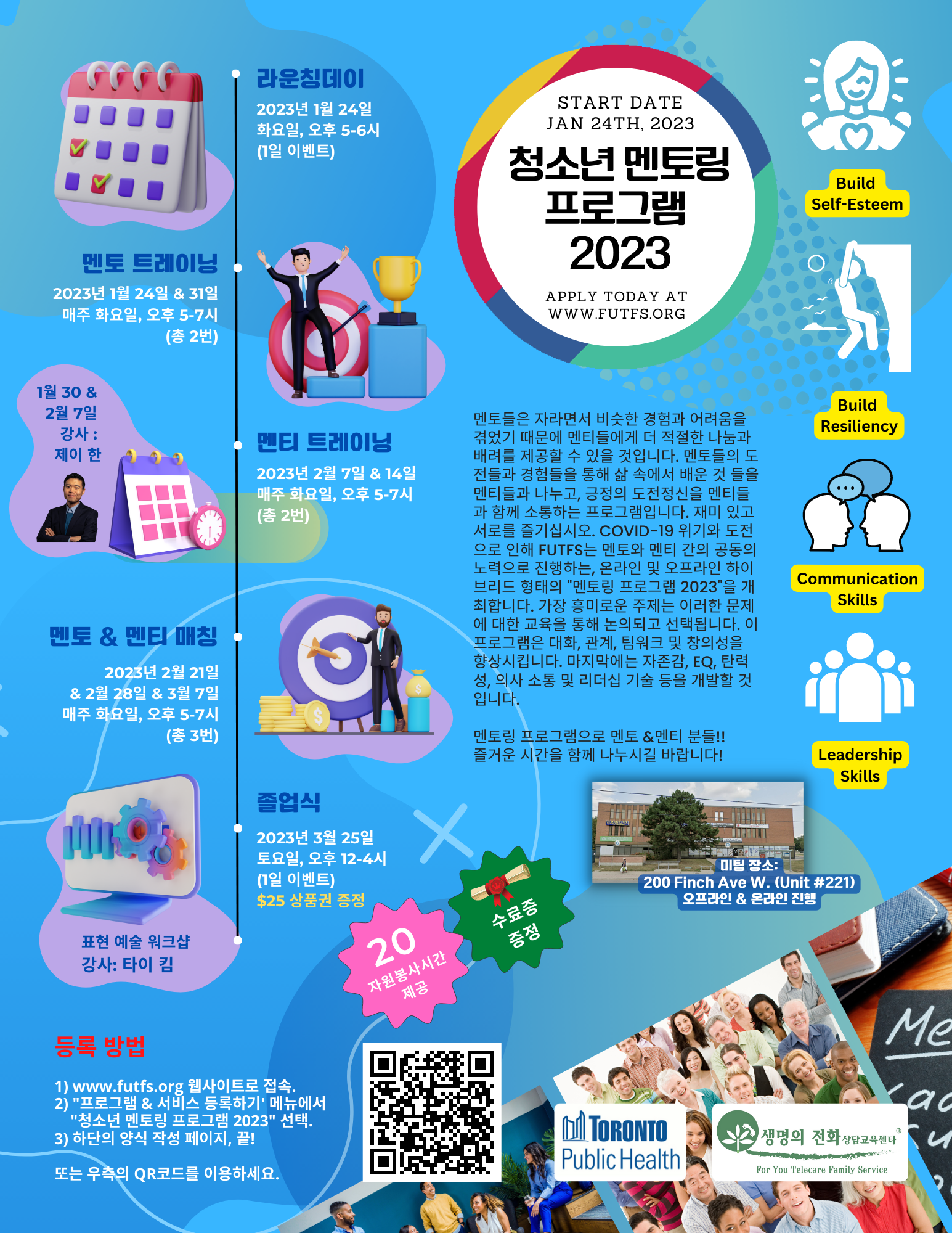 이 프로그램의 첫시작인 라운칭데이가 2023년 1월 24일 화요일 오후 5시부터 7시까지 하루 진행하게 되며, 이후 2월 7일부터 3월 7일까지 매주 화요일 오후 5-7시에 멘티 트레이닝 및 멘토 & 멘티 매칭 프로젝트가 오프라인 대면 (200 Finch Ave West, Unit #221) 및 줌미팅 방식으로 진행됩니다. 참여시 자원봉사시간 드립니다.