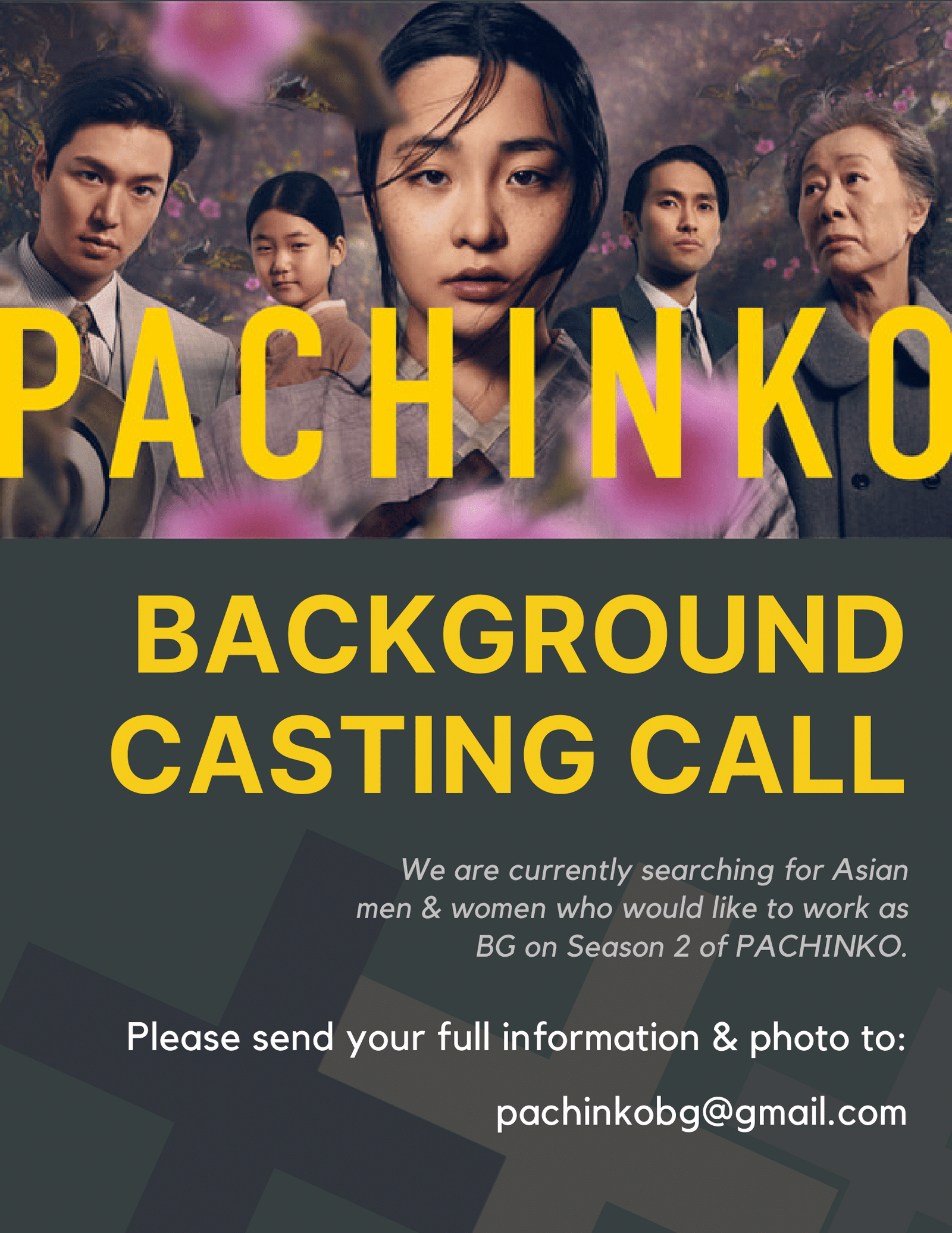 2022년 3월 25일부터 Apple TV+ 에서 방영된 파친코가 시즌 2 제작에 들어가면서 캐스팅 업체에서 한국인 보조 출연자 (엑스트라)들을 모집하고 있습니다.