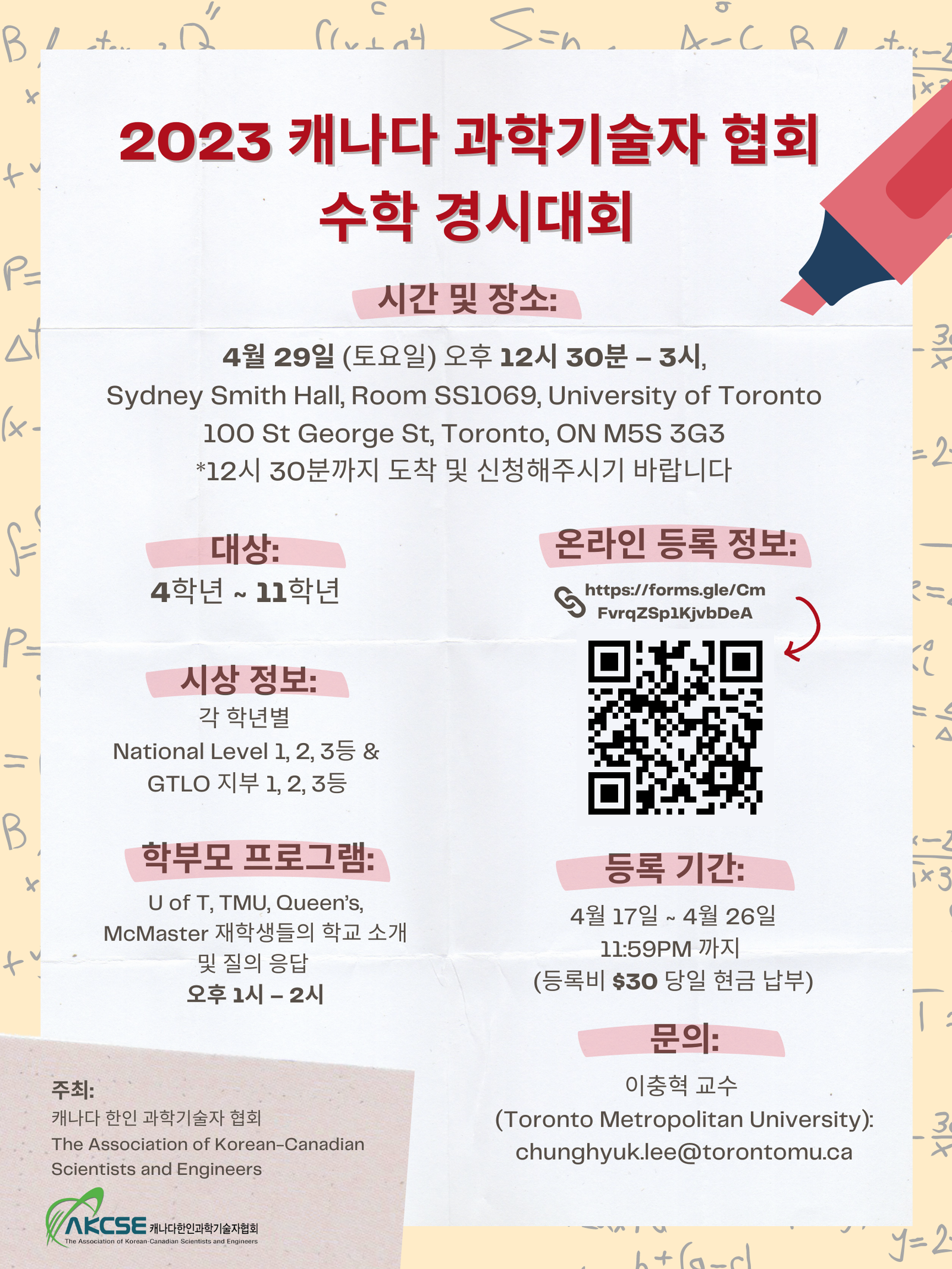 캐나다한인과학기술협회 주회 전국 수학 경시대회 (2023년 4월 29일 토요일)