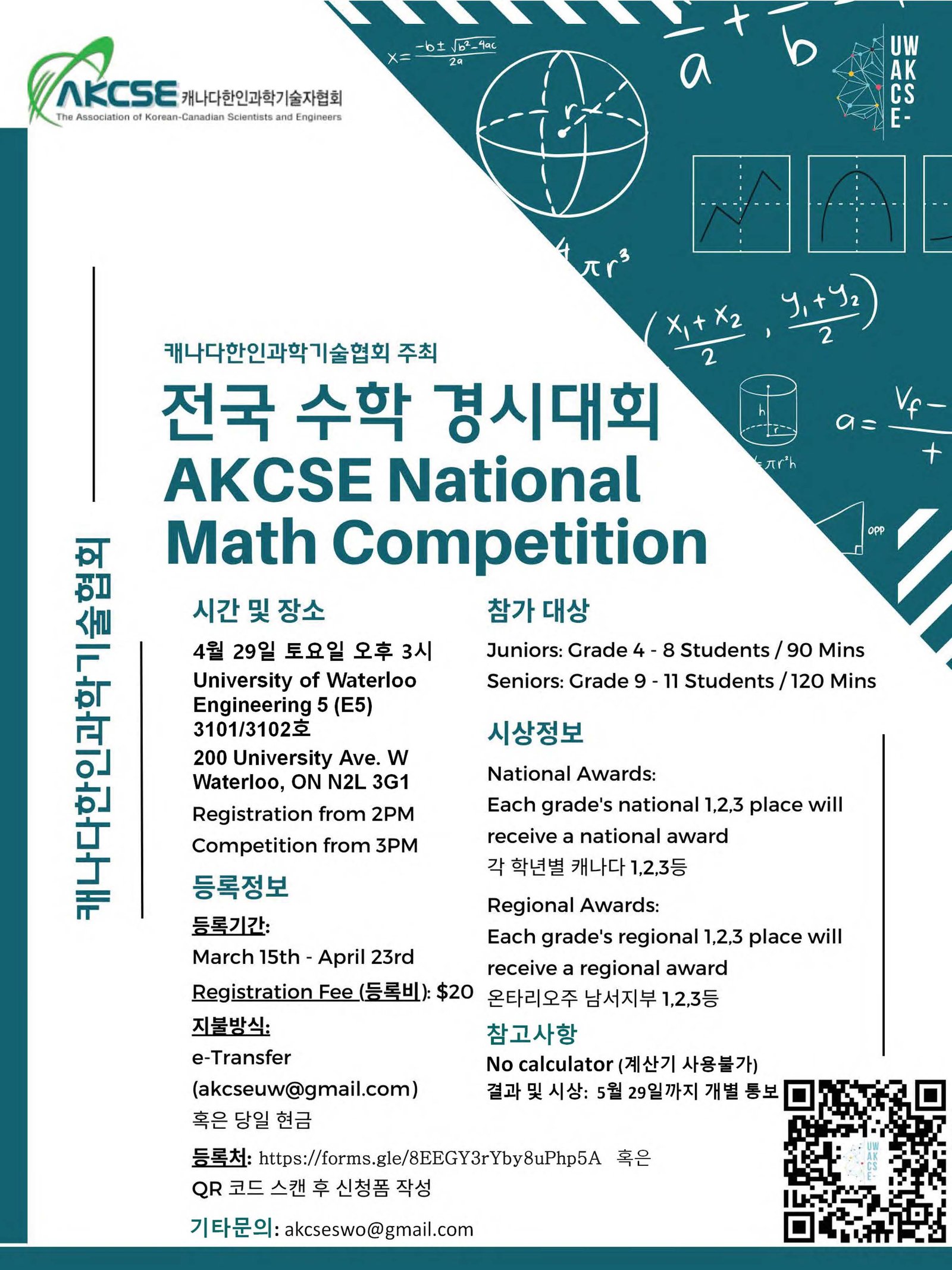 캐나다한인과학기술협회 주최 전국 수학 경시대회에 대해 안내드립니다.