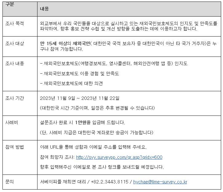 조사기관 서베이피플에서 외교부의 의뢰로 "2023년도 재외국민보호제도 인지도 및 만족도 조사" 참여 희망자를 모집 중에 있습니다.