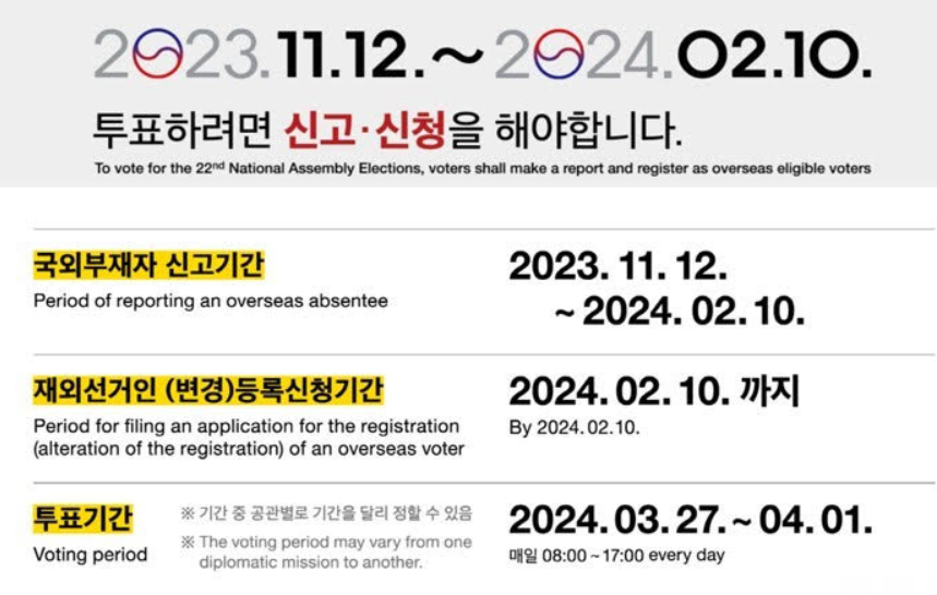 제22대 국회의원 재외선거 신고신청 기한이 2024년 2월 10일에 종료됩니다.