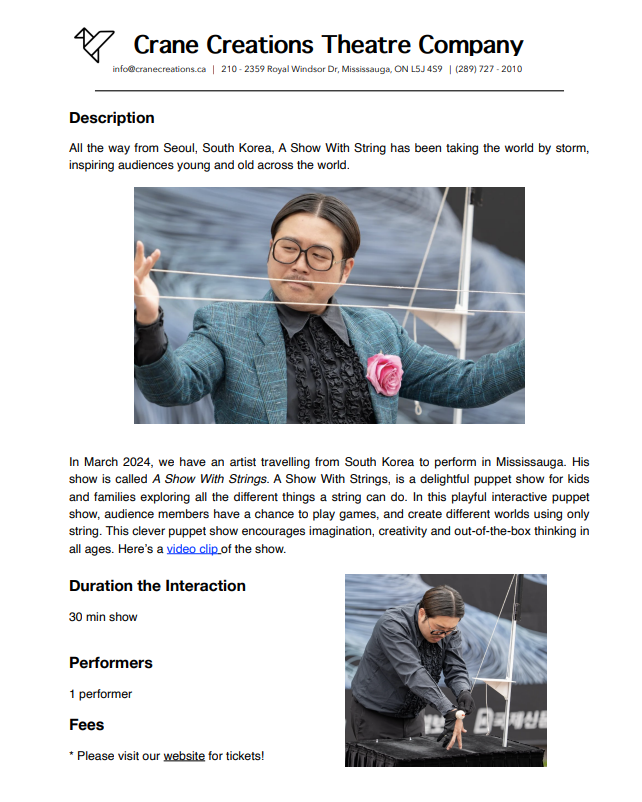 티켓정보: https://www.cranecreations.ca/event/puppet-festival-mississauga/a-show-with-strings/