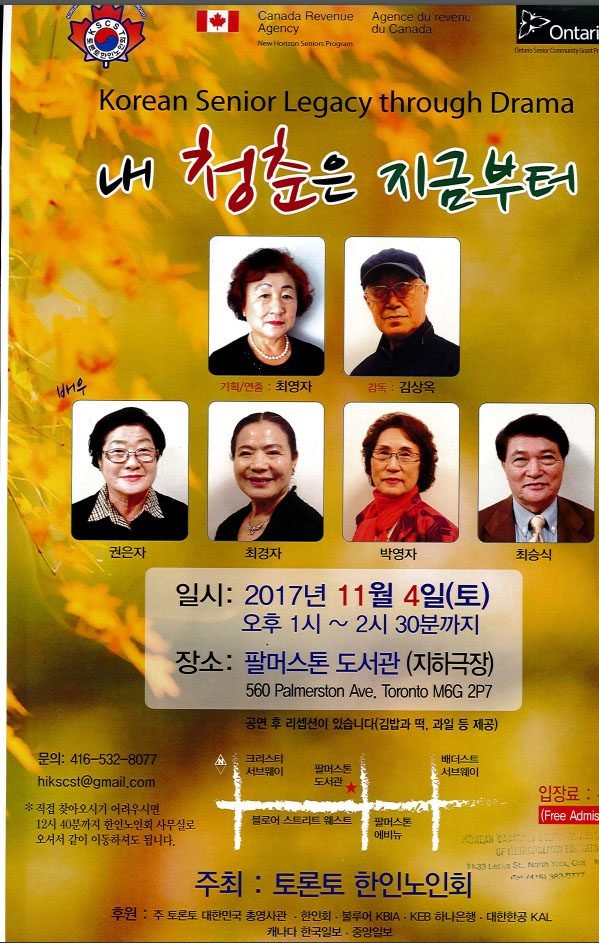 오는 11월 4일에 한인노인회 회원분들께서 '내 청춘은 지금부터' 라는 주제로 연극 공연을 합니다.