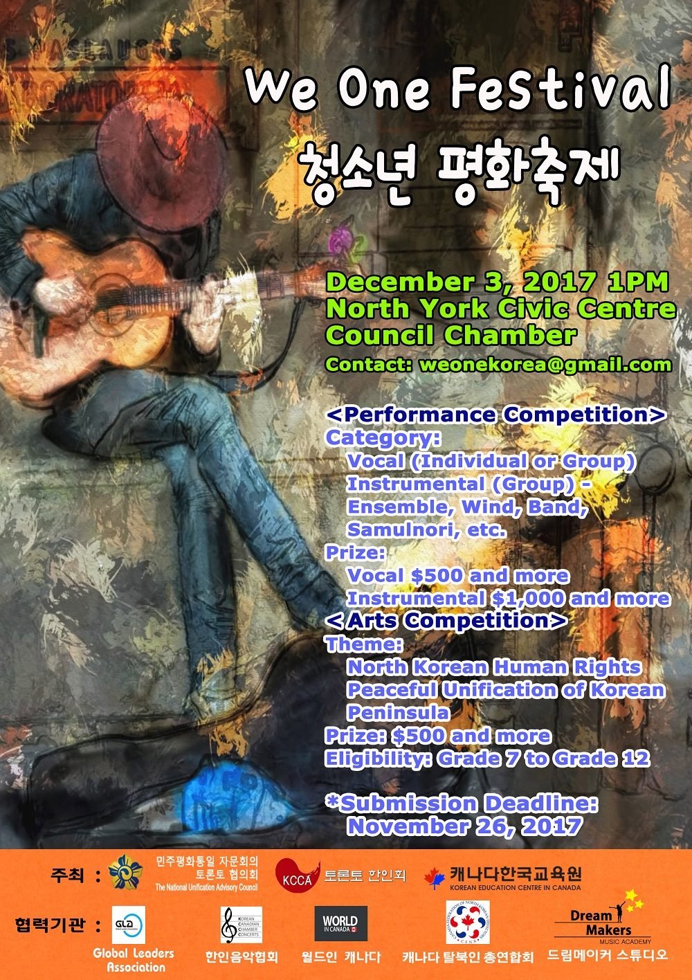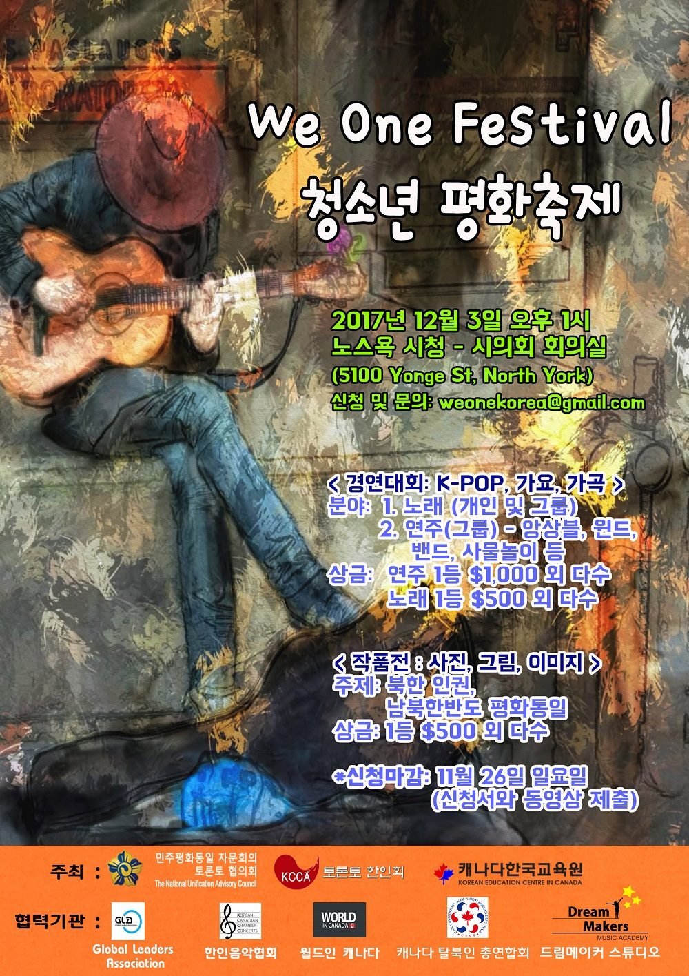 안녕하세요 민주평화통일자문회의 토론토협의회와 토론토 한인회, 캐나다 한국교육원은 2017년 12월 3일 오후 1시부터 6시까지 노스욕 시청 대회의실에서 청년평화축제(We One Festival)을 개최합니다.