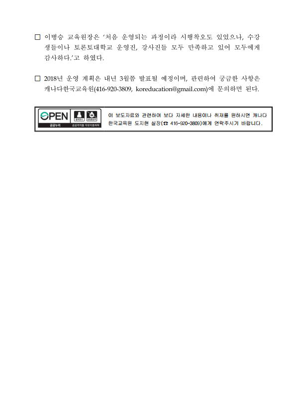 2018년 운영 계획은 내년 3월쯤 발표될 예정이며, 관련하여 궁금한 사항은 캐나다한국교육원(416-920-3809, koreducation@gmail.com)에 문의하면 된다.