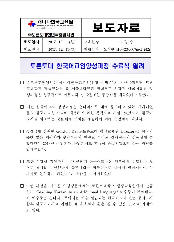 주토론토총영사관 캐나다한국교육원(원장 이병승)은 지난 9월부터 토론토대학교 평생교육원 및 서울대학교과 협력으로 시작된 한국어교원 양성과정을 성공적으로 마무리하고, 12월 8일 종강식을 개최였다고 밝혔다.