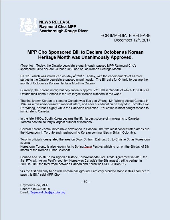 2017년 5월에 캐나다 온타리오 주 한인 첫 주의원인 조성준 의원이 발의한 10월을 한국문화 유산의 달로 지정하자는 안건이 어제 2017년 12월 10월 12일 만장일치로 통과되었다.