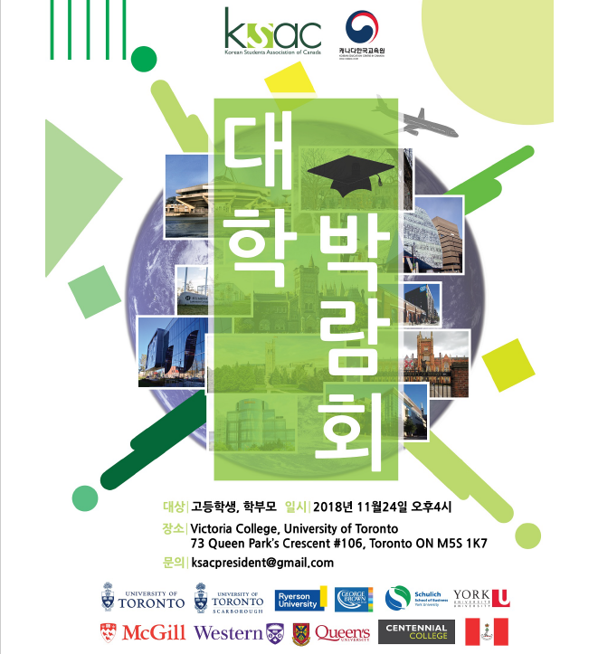 주토론토대한민국총영사관 캐나다한국교육원은 캐나다대학교한인학생연합회 (KSAC, 대표 김석주) 와 주관으로 캐나다 대학입학박람회를 개최한다.