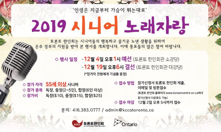 토론토 한인회에서는 시니어들의 행복하고 즐거운 노년생활을 위하여 기획한 '인생은 지금부터, 가슴이 뛰는대로' 라는 주제로 2019 시니어 노래자랑 대회를 개최합니다.