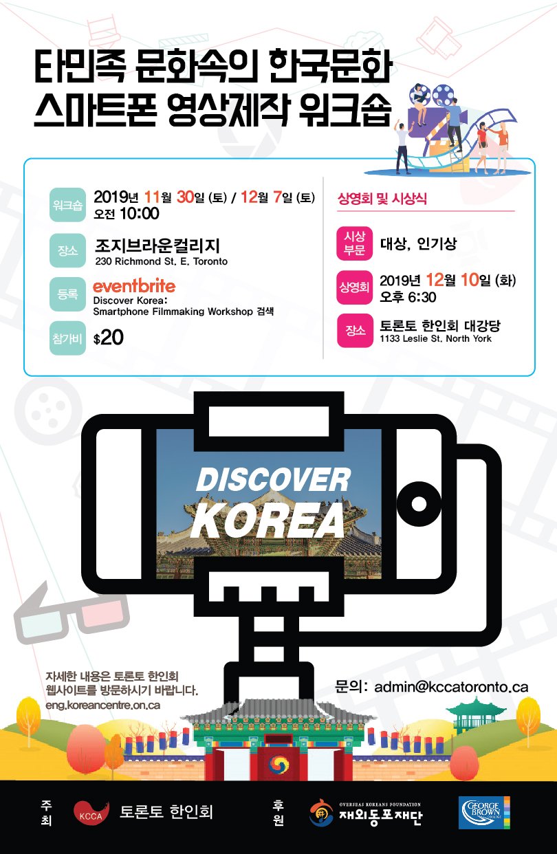토론토 한인회(회장 이진수)는 스마트폰 영상제작에 관심있는 현지인과 한인을 대상으로 ‘타민족 문화속의 한국문화’를 주제로 스마트폰 영상제작 워크숍을 개최한다. 오는 11월 30일(토)과 12월 7일(토) 양일에 걸쳐 오전 10시부터 오후 2시까지 진행되는 이번 워크숍은 스마트폰의 카메라 기능에 대한 이해와 촬영, 편집까지 실습위주의 교육과정이 제공된다. 강의는 조지브라운 컬리지 (230 Richmond St. E. Toronto)에서 실시되며 토론토 스마트폰 영화제 48시간 영화제작 챌린지에서 대상을 수상한 닉 코시크 감독이 강의를 진행한다.수료생 작품은 오는 12월 10일(화) 오후 6시 30분 토론토 한인회관 (1133 Leslie St. North York)에서 상영되며 대상과 인기상에게 상품이 주어진다. 신청은 Eventbrite 페이지에서 할 수 있으며 등록비는 20불이다. (간식제공)한인회 관계자는 스마트폰 영상제작을 통하여 타민족의 문화와 삶속에서 보여지는 한국의 문화를 찾아가면서 서로의 문화에 대한 관심과 이해도를 높이고, 타민족과의 교류를 통해 우호적인 관계 증진 뿐 아니라 더 나아가서는 국가간의 서로 협력하는 상생의 관계로 발전하기를 기대한다고 전했다.자세한 내용은 아래를 참고하기 바란다.