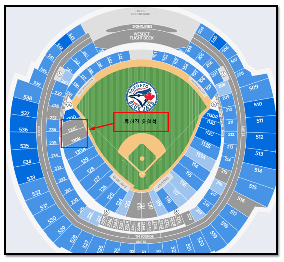 블루제이스 개막전은 2020년 3월 26일 (목) 오후 3:37분 로저스 센터 (1 Blue Jays Way, Toronto)에서 열리며 한인회는 “류현진 응원석” 티켓을 원가보다 저렴한 80불로 (1인 기준) 동포들에게 제공할 예정이다. 응원석은 100 레벨 3루수 쪽으로 배정 받았다.