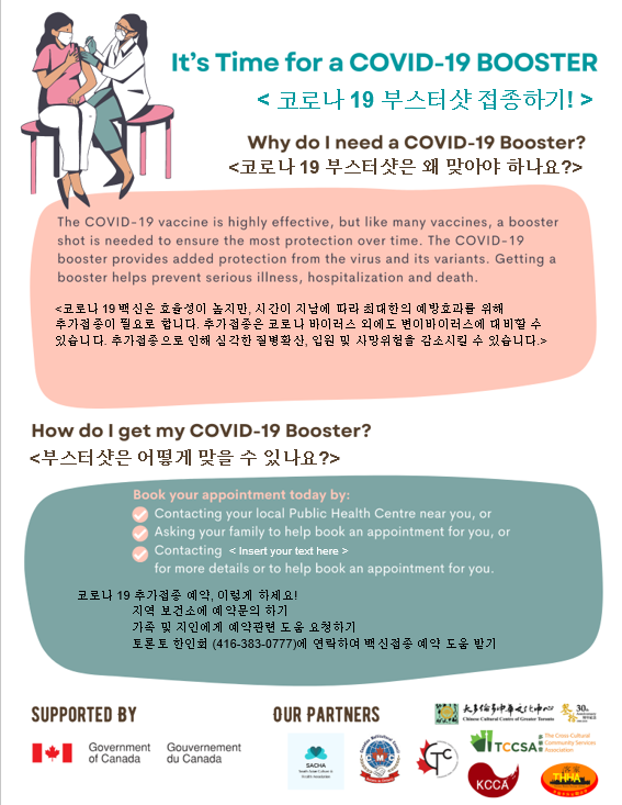 토론토 한인회는 Chinese Cultural Centre of the Greater Toronto 가 주최한 Building Trust for Action 프로젝트에 Canadian Multicultural Council, Canadian Tamil Congress, South Asian Culture & Health Association, The Cross-Cultural Community Services Association 그리고 Toronto Hakka Heritage Alliance를 포함한 여러 단체들과 함께 파트너쉽을 맺고 있습니다. 백신에 대한 위험 인식 및 의사 결정의 문제를 다루기 위해서 아시아 공동체 파트너쉽 단체들이 협력하여 백신에 대한 교육자 및 지원자 역할을 하고 있습니다.